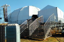 Estão inclusos três camarins de octanorm com perfis de alumínio e placas de TS medindo 4,00m x 4,00m que podem ser montados sob a cobertura do palco ou possuir cobertura independente. Opção de contratação avulsa de torres para o sistema de delay.
